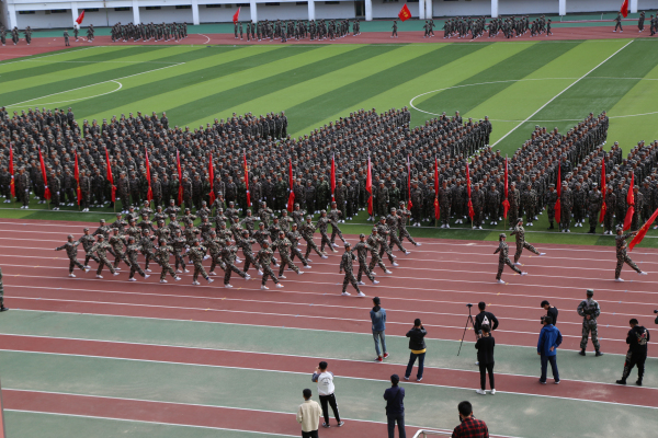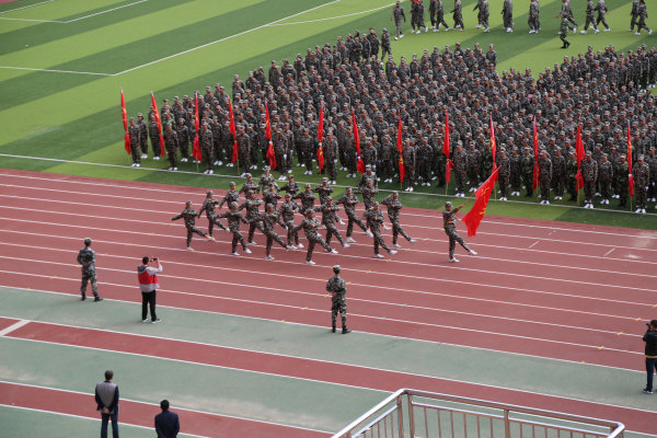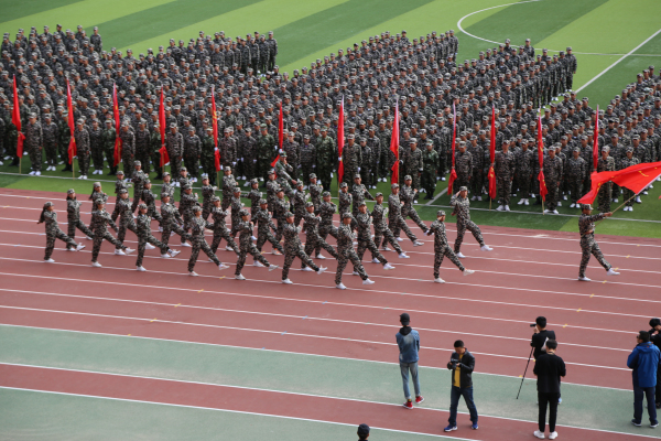 检阅仪式结束后,进行了分列式表演。1900名参训新生组成的42个中队方阵,在国旗护卫队的引领下,踏着整齐划一的步伐、喊着高亢嘹亮的口号,依次通过主席台,接受来宾以及学院领导的检阅。